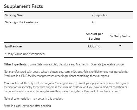 Ipriflavon je močno prehransko dopolnilo, znano po svojih ugodnih učinkih na zdravje kosti. Ta izdelek je zasnovan tako, da podpira mineralizacijo in zmanjšuje tveganje za osteoporozo, zlasti pri ženskah v menopavzi. Jemanje zdravila Ipriflavone lahko povzroči boljšo absorpcijo kalcija, ki je bistvenega pomena za ohranjanje zdravih in močnih kosti.