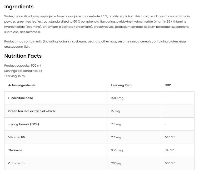 L-Carnitine Liquid je edinstven izdelek, ki združuje močne lastnosti L-karnitina, zelenega čaja in kroma, da vam zagotovi učinkovito rešitev za hujšanje in izboljšanje telesne vzdržljivosti. L-karnitin ima ključno vlogo pri transportu maščobnih kislin v mitohondrije, kjer izgorevajo za energijo. Zeleni čaj je znan po svojih antioksidativnih lastnostih, ki pomagajo v boju proti prostim radikalom, medtem ko krom pomaga uravnavati raven sladkorja v krvi, kar je še posebej pomembno za nadzor apetita. Znanstvene raziskave podpirajo koristi L-karnitina, saj kažejo, da lahko poveča izgorevanje maščob in izboljša telesno zmogljivost. Zeleni čaj je bil povezan tudi s povečanim metabolizmom in izgubo teže, krom pa lahko zmanjša željo po hrani, zlasti po sladkih snoveh. Pomembno je upoštevati, da se morajo posamezniki z znanimi zdravstvenimi težavami ali tisti, ki jemljejo zdravila, pred uporabo izdelka posvetovati z zdravnikom. Ni priporočljivo za nosečnice in doječe matere. Za najboljšo nakupovalno izkušnjo Feel You ponuja odlične cene in kakovostne izdelke, ki izpolnjujejo visoke standarde varnosti in učinkovitosti. Nakupujte z zaupanjem in izkoristite posebne ponudbe. **Ne pozabite pogledati druge fotografije izdelka za vse sestavine izdelka!**