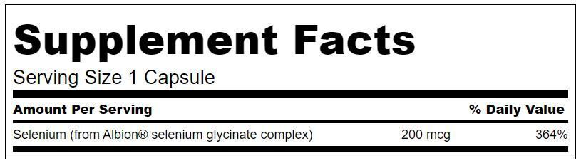 Vsaka kapsula vsebuje 200 mikrogramov selena (iz Albion® kompleksa selenijevega glicinata)