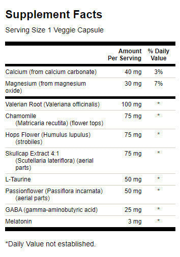 Sestavine : kalcij, magnezij, kamilica, korenina baldrijana, skulterija, GABA, hmelj, pasijonka, melatonin