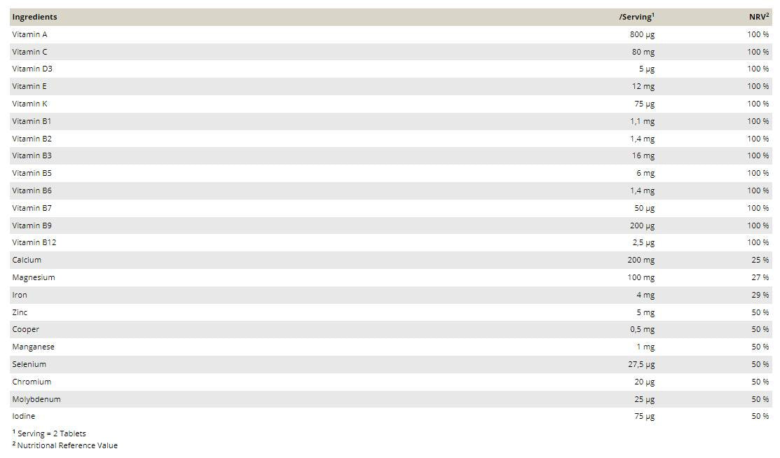 Vsaka tableta VITAMIN AZ vam zagotavlja kombinacijo 28 bistvenih vitaminov, mineralov in elementov v sledeh za vaše telo. Tablete so »časovno sproščene«, kar pomeni, da se v telesu enakomerno dovajajo v nekaj urah in se optimalno absorbirajo oziroma izkoristijo.