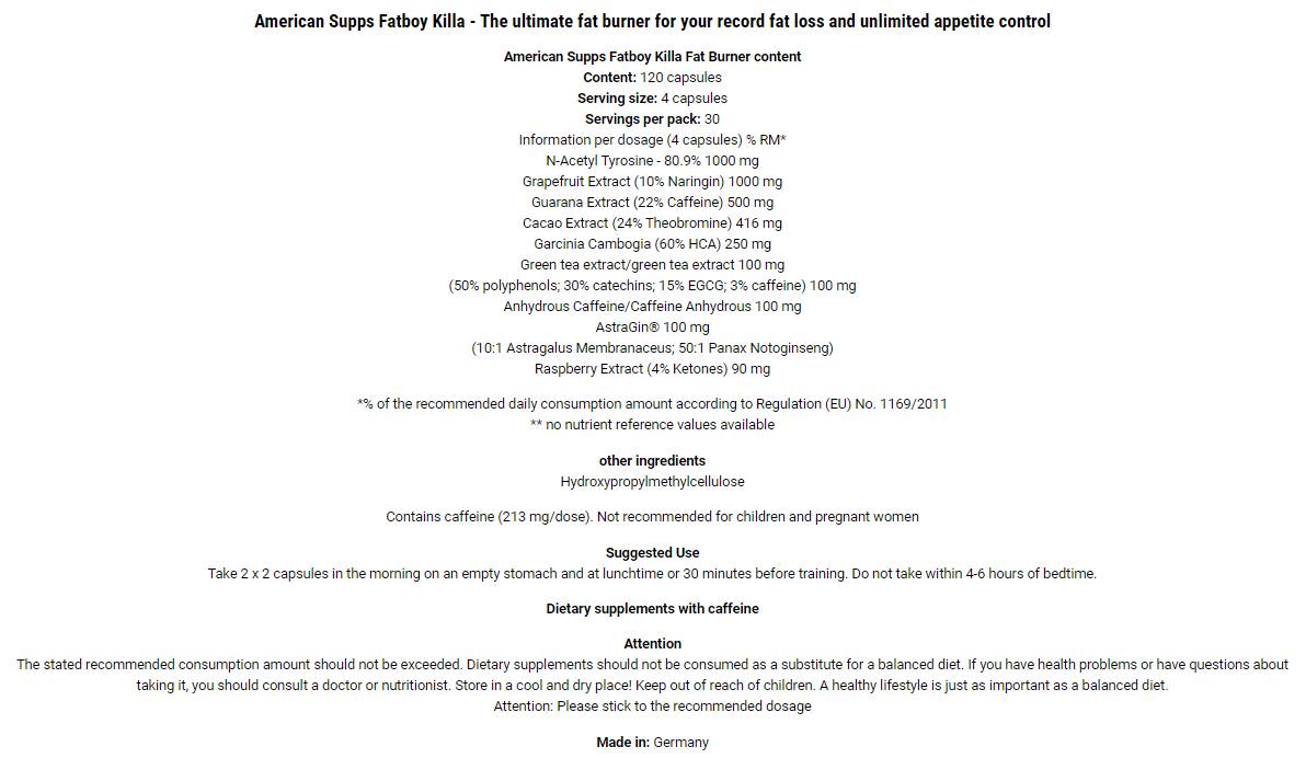 Fatboy Killa® je inovativen topilec maščob priznane blagovne znamke številka ena za tekoča prehranska dopolnila. Ta formula, razvita v Nemčiji, je bila ustvarjena z glavnim ciljem podpirati izgorevanje maščob in olajšati doseganje želene teže. Glavne učinkovine delujejo sinergistično na pospeševanje metabolizma in spodbujanje termogeneze, kar vodi do učinkovitejšega izgorevanja maščob.