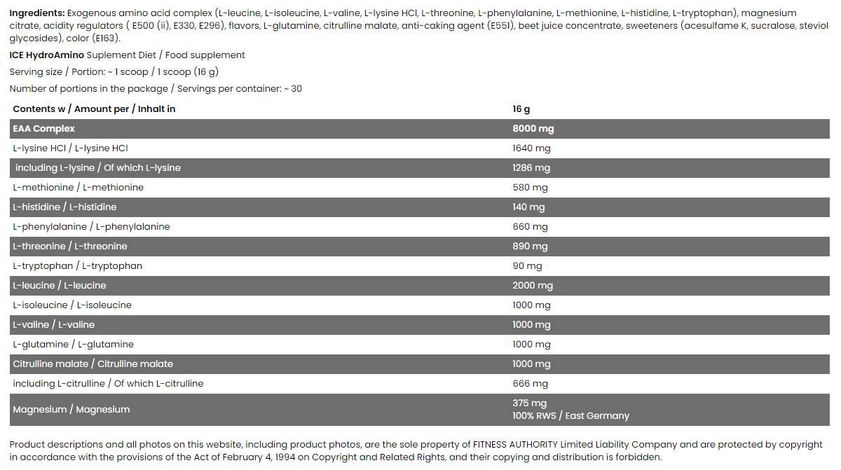 Fa Hydro Amino / Ice Series je odlično, kompleksno prehransko dopolnilo, ki združuje visoke odmerke BCAA z esencialnimi aminokislinami. Izdelek je primeren za vse športnike, ki želijo izboljšati okrevanje in tonus ter podporo procesi izgradnje mišic v njihovem telesu.