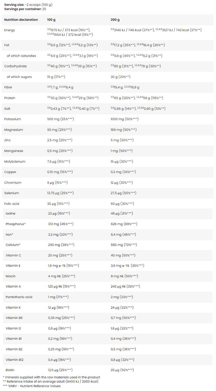 Ena porcija izdelka vsebuje približno 35 gramov beljakovin , ki je glavni element za okrevanje in rast mišic.