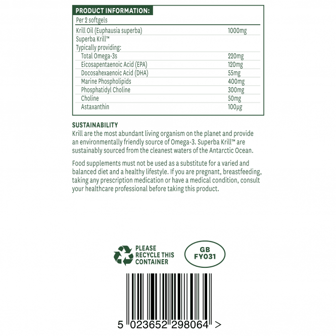Natures Aid Antarktično krilovo olje Superba je pridobljen iz zooplanktona iz najčistejših voda Antarktičnega oceana in je certificiran s strani British Council for Sustainable Sea Basin Development. Mehke tablete brez okusa, vonja in jih je enostavno pogoltniti. Krilovo olje je odličen vir omega 3 maščobnih kislin, vključno z EPA in DHA. Zanj je značilna visoka koncentracija fosfolipidov, zaradi česar ga telo lažje izkoristi, manj kot ribje olje, saj so na splošno omega-3 maščobne kisline v ribjem olju shranjene v obliki trigliceridov. Krilovo olje vsebuje fosfatidilholin in astaksantin. Fosfatidilholin je glavni fosfolipid v človeškem telesu, gradnik celičnih membran. Sodeluje pri številnih procesih v telesu, kot je transport maščob iz jeter v krvni obtok. Podpira stanje jeter in njihove funkcije. Astaksantin je naravni karotenoid, ki zaradi svoje edinstvene strukture zagotavlja širok spekter antioksidativnih koristi. Ker lahko astaksantin prehaja krvno-možgansko in krvno-mrežnično pregrado, lahko zagotovi močno antioksidativno zaščito neposredno očem, možganom in živčnemu sistemu. Protivnetne lastnosti omega-3 maščobnih kislin ščitijo pred boleznimi srca in ožilja, rakom in diabetesom tipa 2. Izboljšujejo prekrvavitev telesa, znižujejo slab holesterol in krvni tlak ter podpirajo zdravje sklepov.