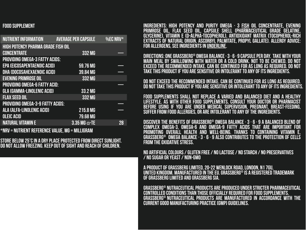 Grassberg Omega 3-6-9 Balance 1000 mg je kombinacija esencialnih maščobnih kislin za naše zdravje. Vsaka od treh maščobnih kislin ima koristi za naše zdravje, vendar je pomembno, da so omega 3, 6 in 9 v pravem ravnovesju. Vsebuje uravnotežen odmerek treh koristnih nenasičenih maščobnih kislin in vitamina E.