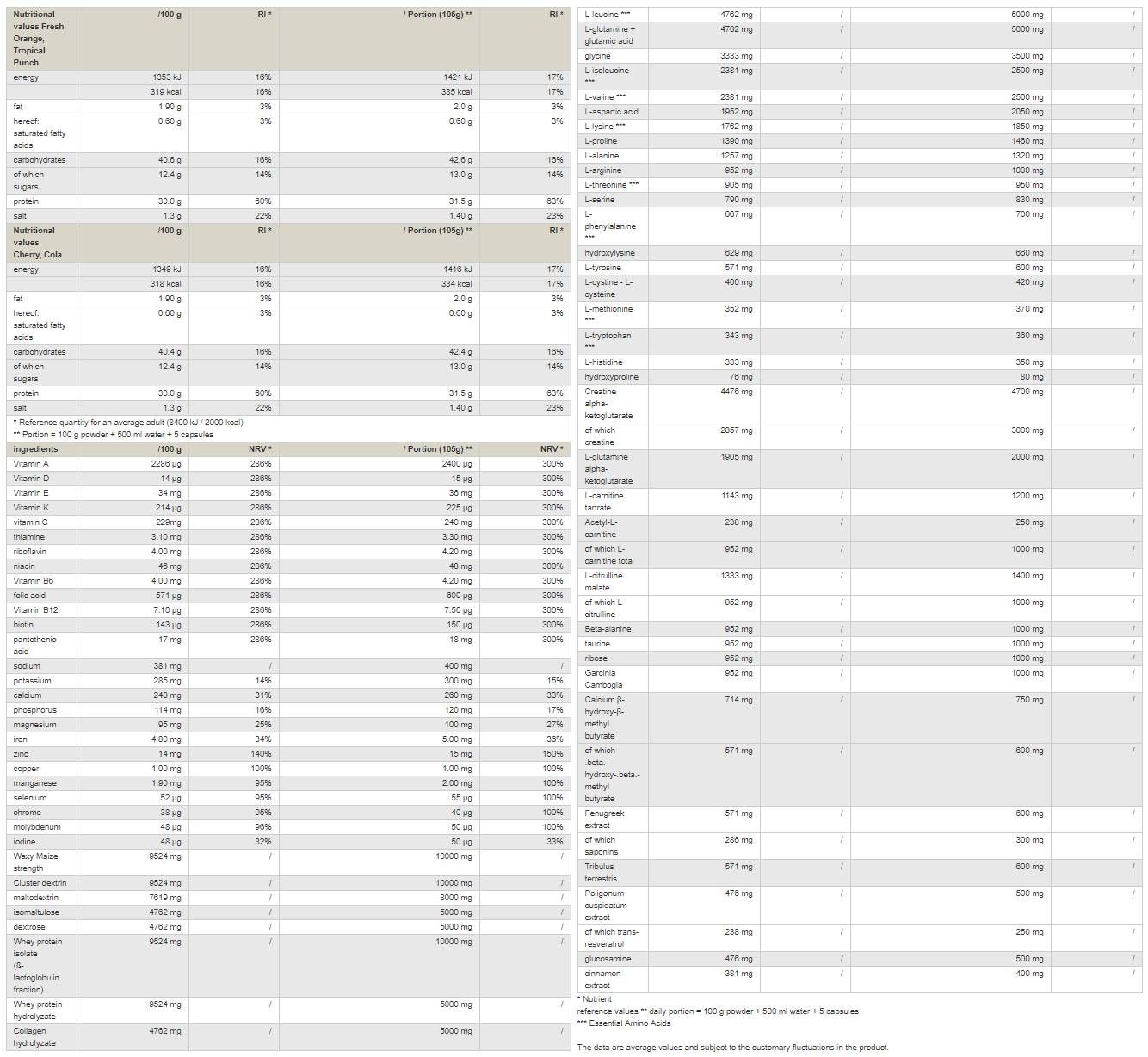 Odmerjanje: Vzemite 1 odmerek dnevno, najbolje takoj po treningu. Ob koncu tedna vzemite 1 odmerek zjutraj takoj po spanju. 100 gramov praška, raztopljenega v 400-500 ml vode, skupaj s 5 kapsulami.