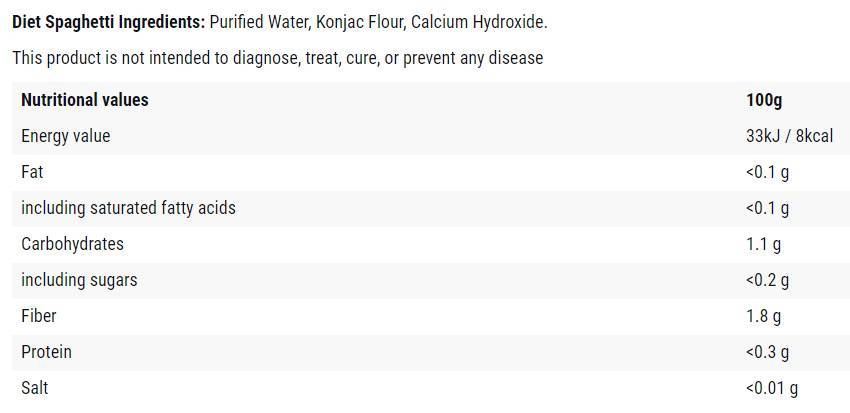 Dieta s špageti je naravni izdelek z glavno sestavino Konjak glukomanan , pridobljen iz korenine rastline Konjac. Ta edinstven izdelek je posebej zasnovan za ljudi, ki sledijo keto dieti in dieti z nizko vsebnostjo ogljikovih hidratov. Zaradi nizke vsebnosti kalorij in odsotnosti škroba, beljakovin, pšenice, glutena in sladkorja je idealna izbira za tiste, ki želijo ostati v formi in poskrbeti za svoje zdravje.