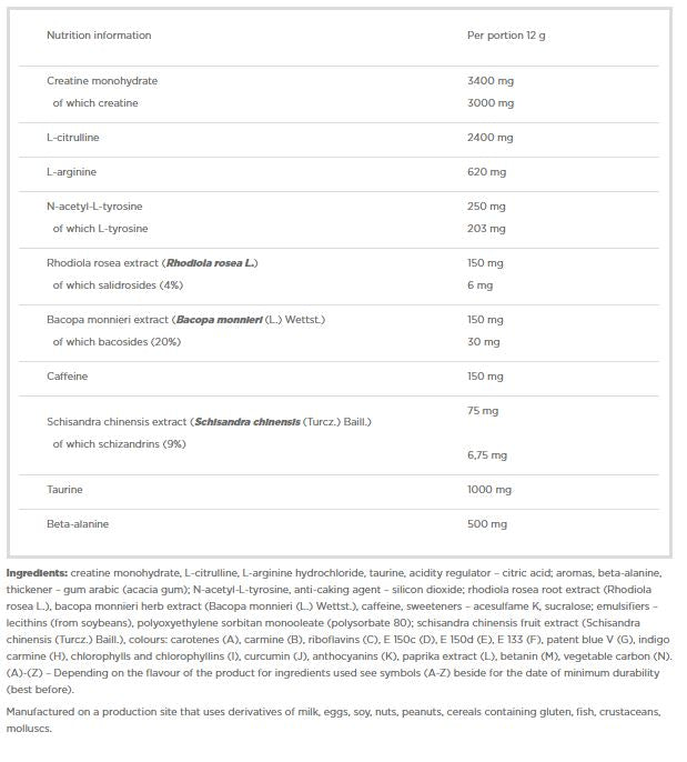 Sestavine: kreatin monohidrat, L-citrulin, L-arginin hidroklorid, taurin, regulator kislosti - citronska kislina; arome, beta-alanin, gostilo - arabski gumi (akacijev gumi); N-acetil-L-tirozin, sredstvo proti strjevanju - silicijev dioksid; izvleček korenine rožne rože (Rhodiola rosea L.), izvleček zelišč bacopa monnieri (Bacopa monnieri (L.) Wettst.), kofein, sladila - acesulfam K, sukraloza; emulgatorji - lecitini (iz soje), polioksietilen sorbitan monooleat (polisorbat 80); schisanizvleček sadja dra chinensis (Schisandra chinensis (Turcz.) Baill.), barvila: karoteni, karmin, riboflavini, E 150c, E 150d, E 133, patentno modro V, indigo karmin, klorofili in klorofilini, kurkumin, antociani, izvleček rdeče paprike, betanin, rastlinski ogljik