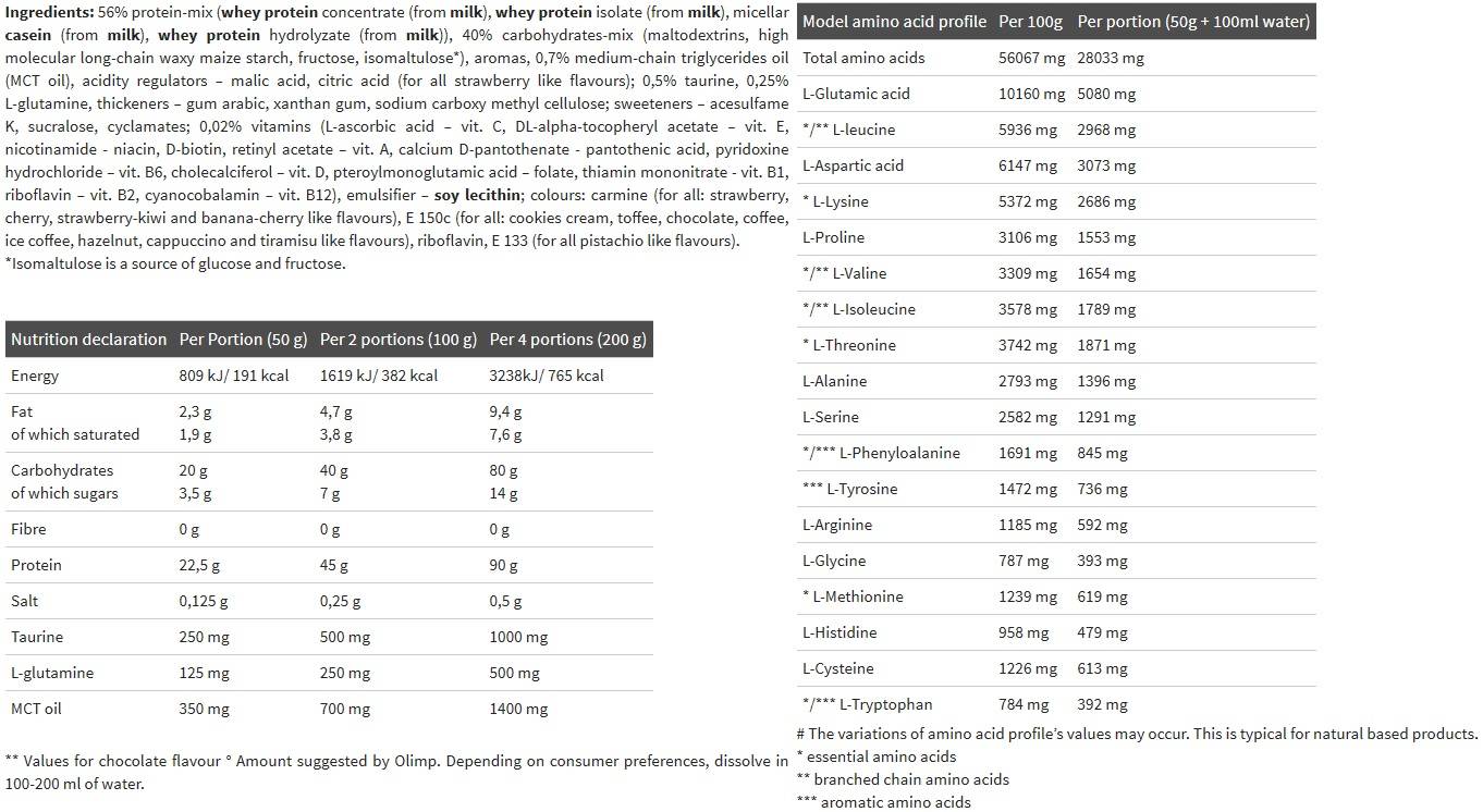 Kombinacija beljakovin (koncentrat sirotkinih beljakovin, micelarni kazein, izolat sirotkinih beljakovin in hidrolizat sirotkinih beljakovin) in ogljikovih hidratov v razmerju 50:50.