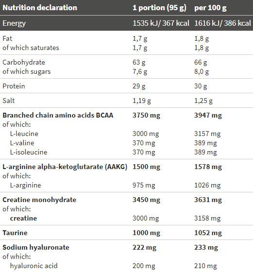 Edinstvena, znanstveno razvita matrika prostih aminokislin, peptidov, počasi in hitro prebavljivih beljakovin, pridobljenih iz najkakovostnejših: hidrolizata in izolata sirotkinih beljakovin, micelarnega kazeina in glutaminskih peptidov. Ta inovativna prehranska matrica je bila posebej izbrana za zagotavljanje neprekinjene oskrbe z anaboličnimi snovmi, ki so ključne za regeneracijo in rast mišic, pridobljenimi iz virov z različnimi aminokislinskimi profili, absorpcijo in kinetiko. Ta sestava zagotavlja hitro in dolgotrajno oskrbo z najdragocenejšimi hranili in anaboličnimi snovmi za rast mišic.