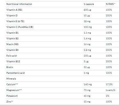 Sestavine: vitamin A, vitamin D, vitamin E, vitamin C, vitamin B1, vitamin B2, niacin, vitamin B6, folna kislina, vitamin B12, biotin, pantotenska kislina, kalcij (Albion® aminokislinski kelat, kalcijev karbonat), magnezij (Albion® aminokislinski kelat, magnezijev oksid, kalij, cink (Albion® aminokislinski kelat), železo (Albion® aminokislinski kelat) kelat (Ferrochel®)), mangan (Albion® aminokislinski kelat), baker (Albion® aminokislinski kelat), jod, selen, izvleček korejskega ginsenga (Panax ginseng L.), od tega 7 % ginsenozidov, lutein, hialuronska kislina